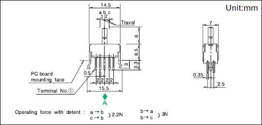 - 开关操作时,如果施加规定以上的负载,开关将有被损坏的可能。请注意不要在开关上施加规定以上的力。