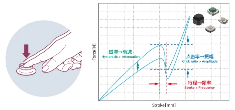 开发者会使用拆分感性词汇得到的物理量开发产品。此时将采用以作动力(Force:力)为纵轴,以点击行程(Stroke:行程)为横轴来表现二者关系的“S-F曲线”。从这张图表上可以看出按下开关时的感觉。例如,在作动力相同的情况下,点击行程短则按压触感鲜明,行程长则轻柔。
