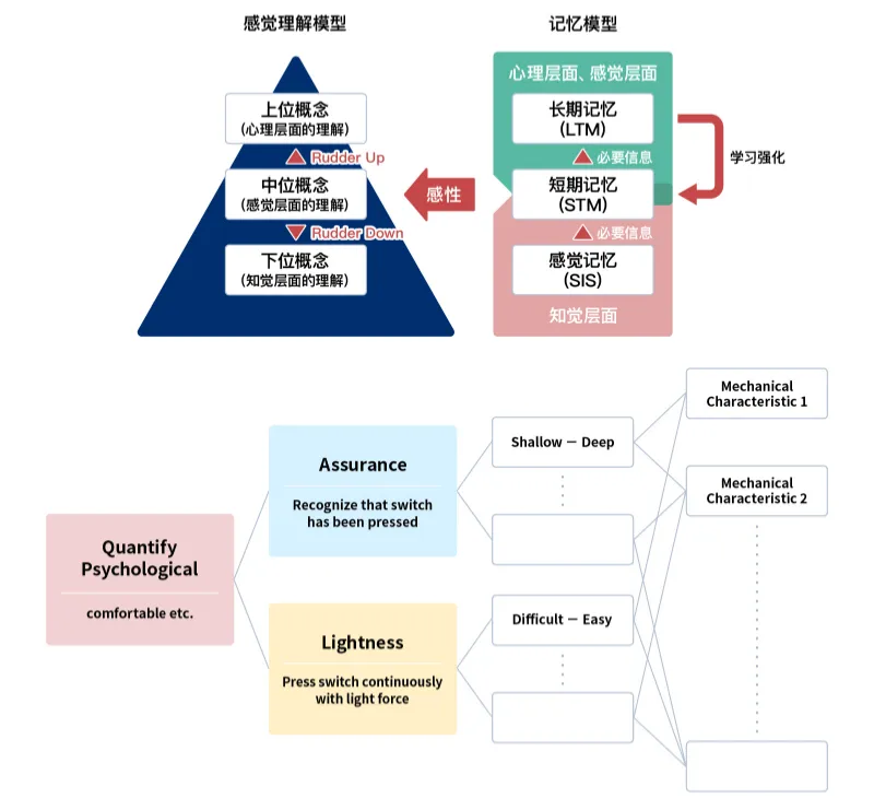 位于最高层的是“心理”,即高级感等感性词汇本身。下一层是“感觉”,指清晰感和轻快感等更加具体的感觉。最下层是“物理”,可以用作动力和点击行程来定量表达。
