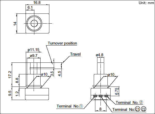- Measures the torque (operating force) necessary to rotate (move) the shaft (lever). Unless otherwise specified, measurement shall be made at ambient temperatures of 5 to 35°C, the shaft rotational speed shall be 60° per second, and the lever traveling speed shall be 20mm per second.