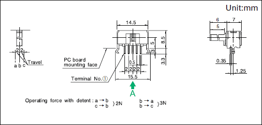 - クリック付タイプは、 クリック位置ではんだ付けください。 クリック中点止めされた状態ではんだ付けされますと、 クリック機構部が変形することがあります。