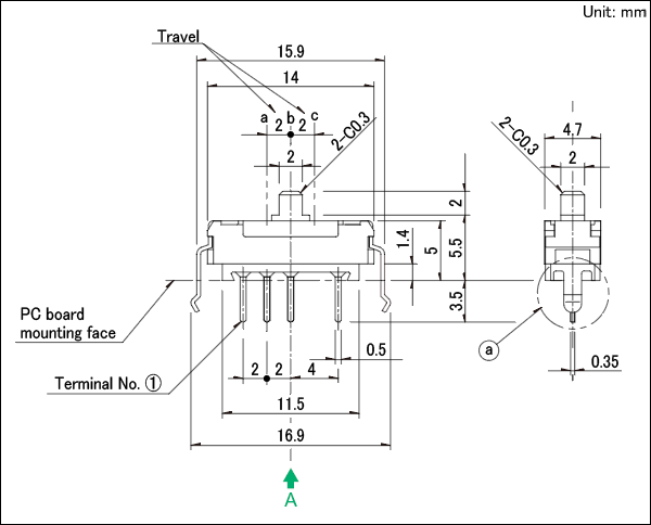 - クリック付タイプは、 クリック位置ではんだ付けください。 クリック中点止めされた状態ではんだ付けされますと、 クリック機構部が変形することがあります。
