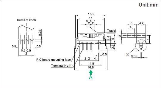 - クリック付タイプは、 クリック位置ではんだ付けください。 クリック中点止めされた状態ではんだ付けされますと、 クリック機構部が変形することがあります。