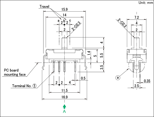 - クリック付タイプは、 クリック位置ではんだ付けください。 クリック中点止めされた状態ではんだ付けされますと、 クリック機構部が変形することがあります。